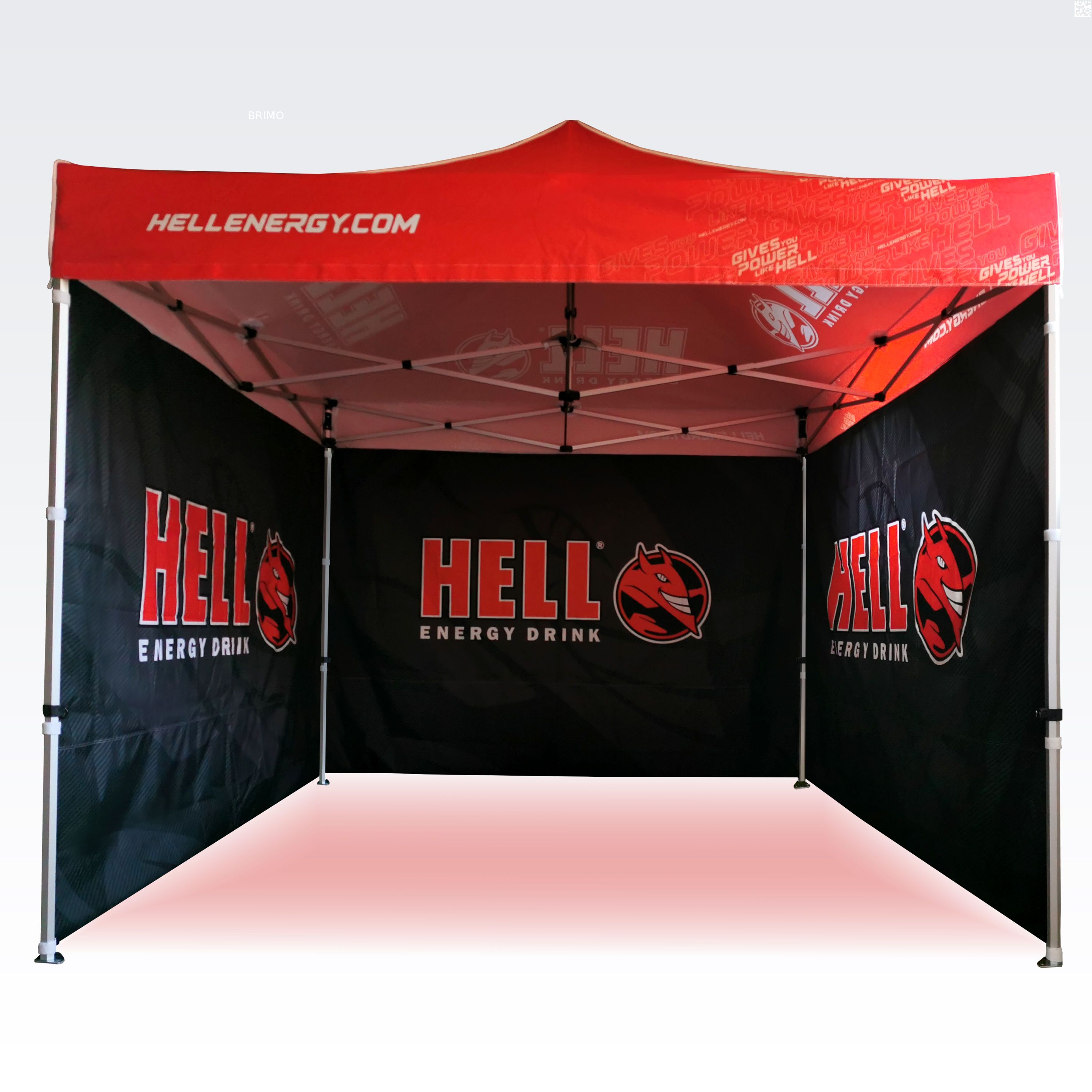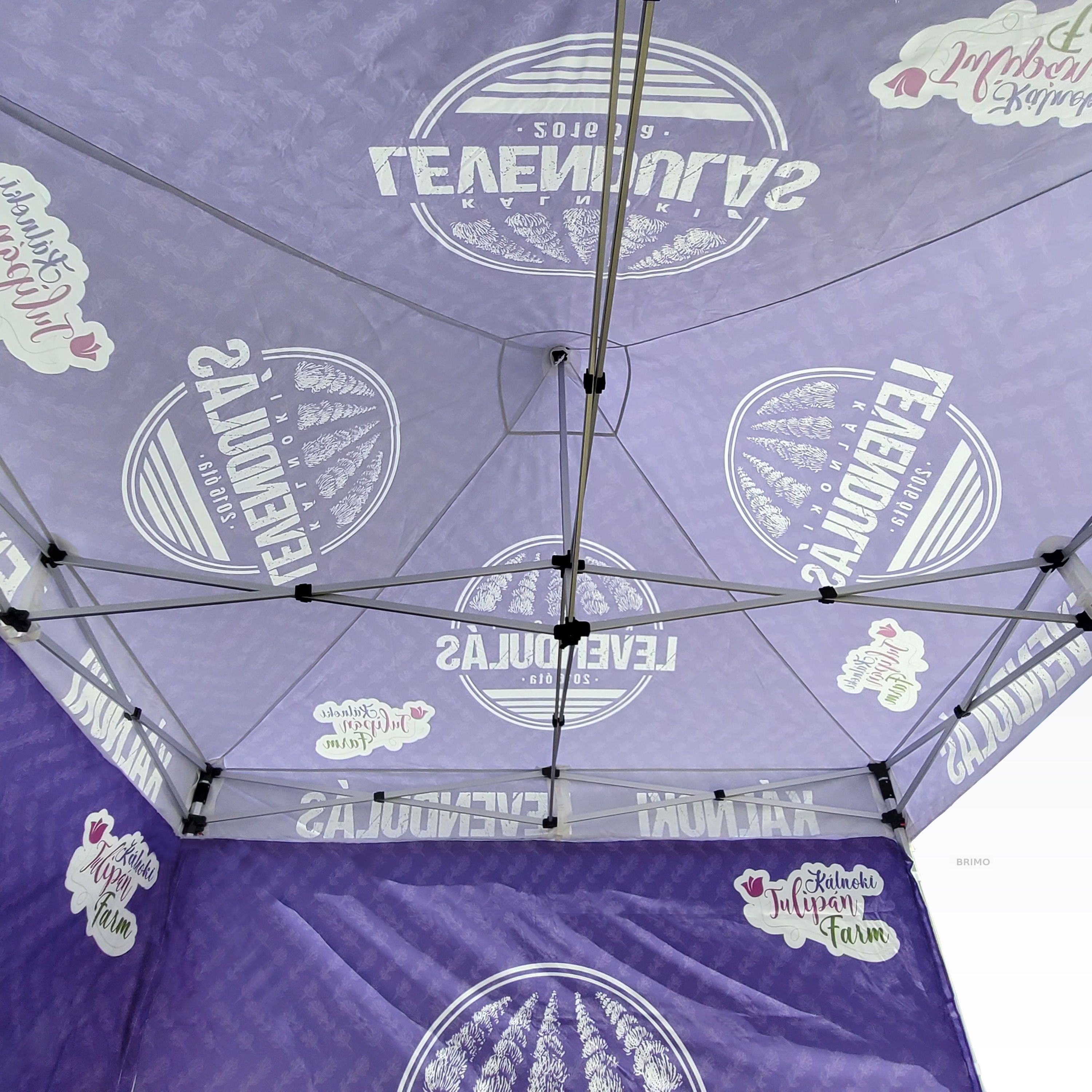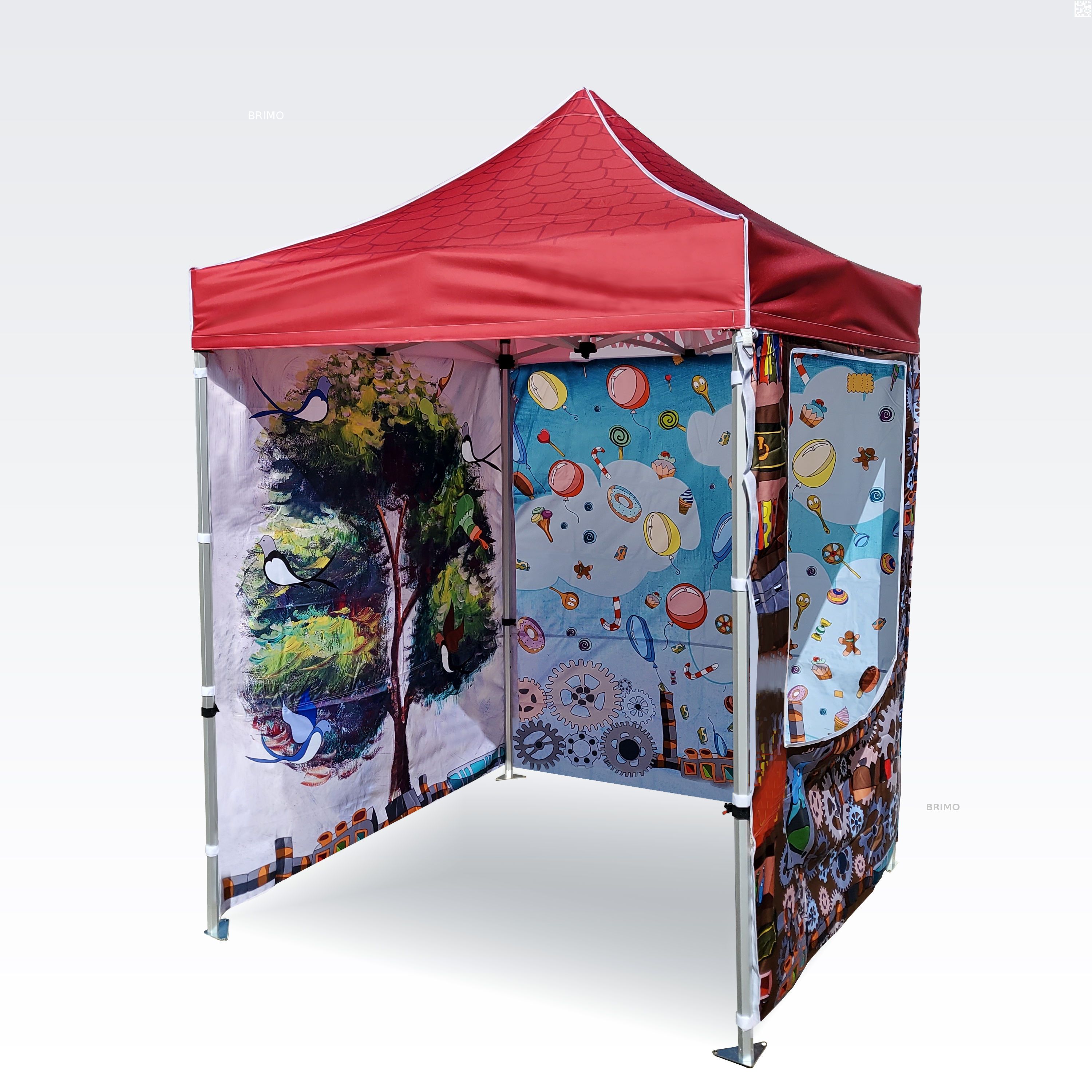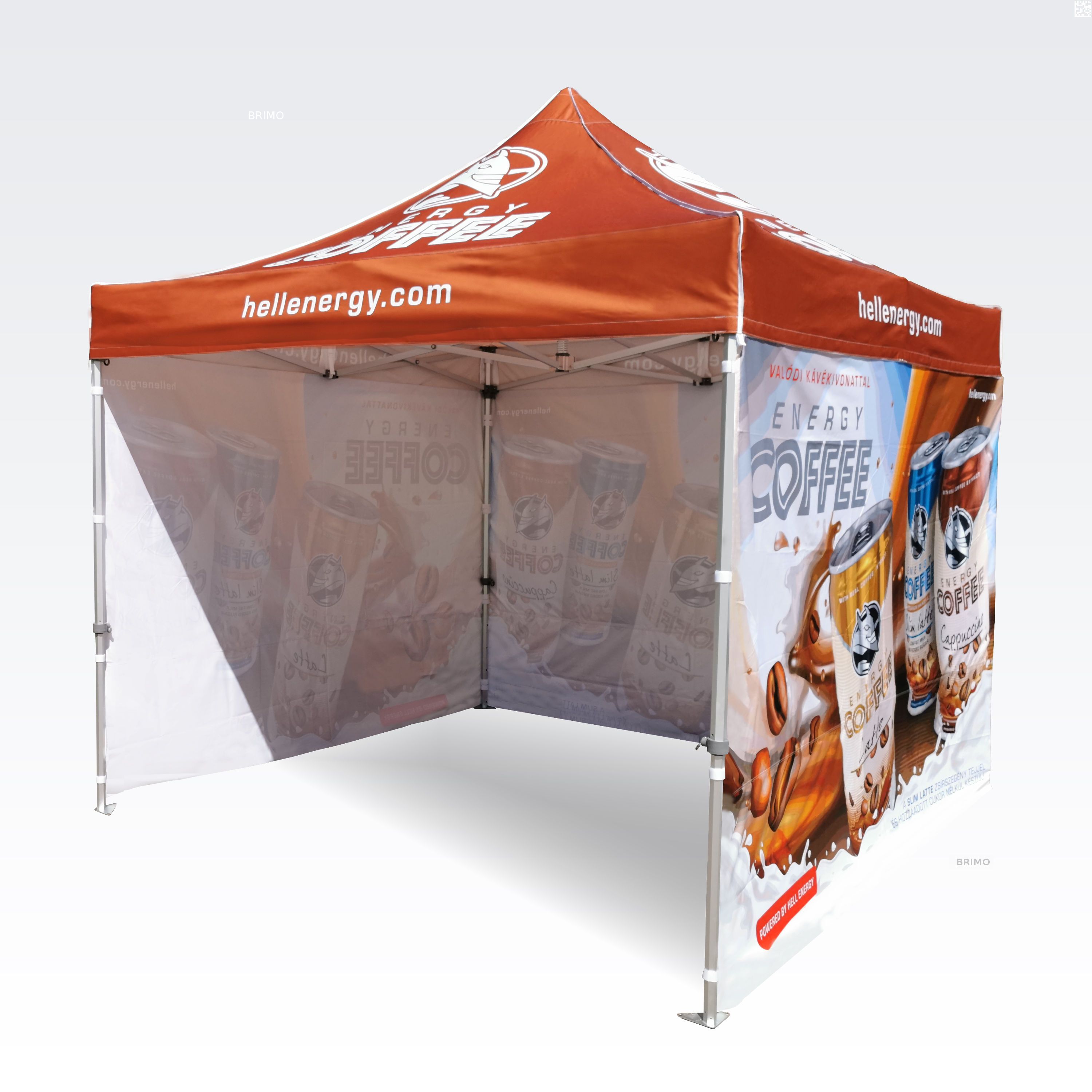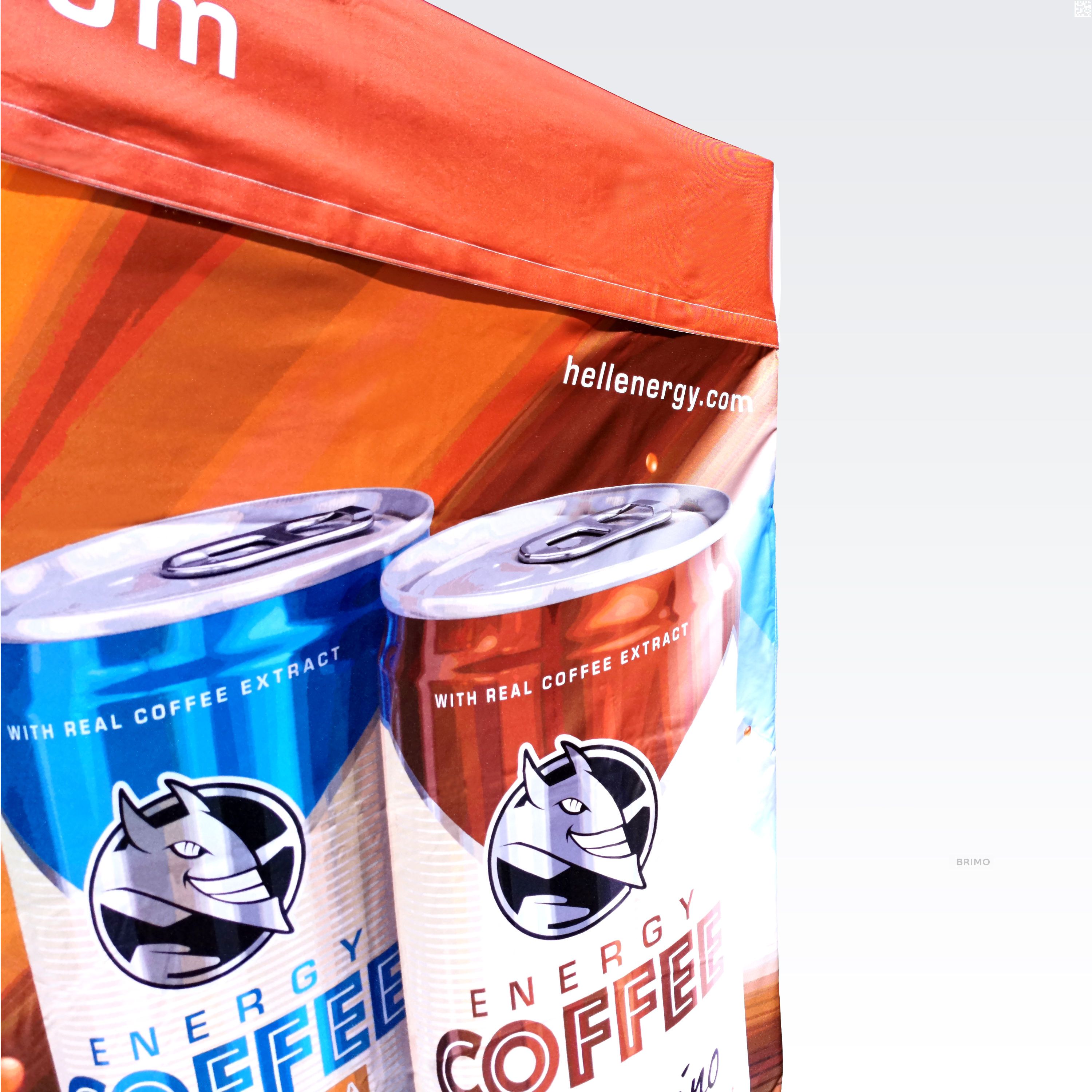 Reklāmas teltis ar digitālo sublimācijas druku. Apdruka rodas ķīmiskā procesa laikā, tinte augstas temperatūras ietekmē iekļūst tieši auduma struktūrā. Logotips, uzraksts, jebkura veida grafika telts iekšpusē vai ārpusē, pēc klienta vēlmēm.