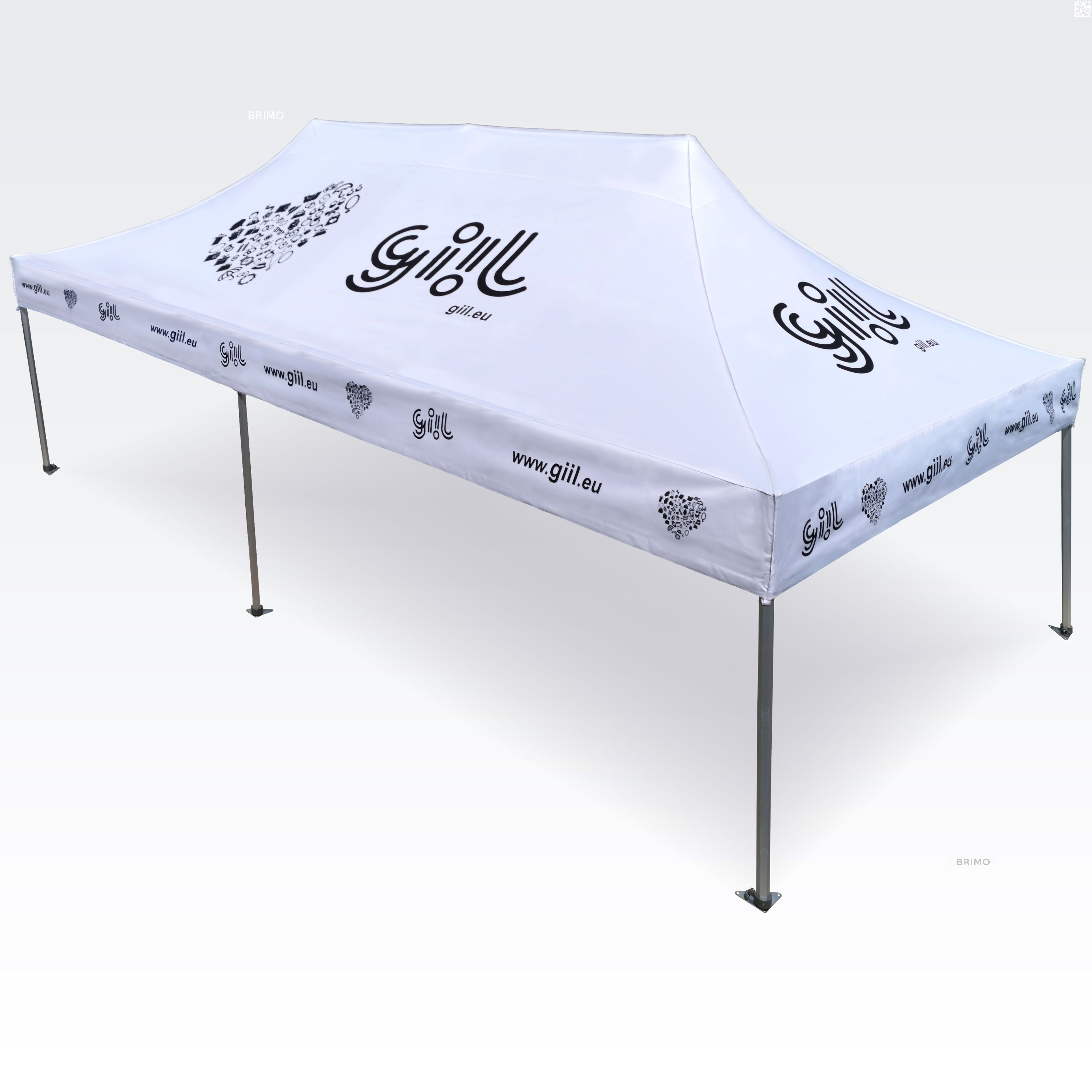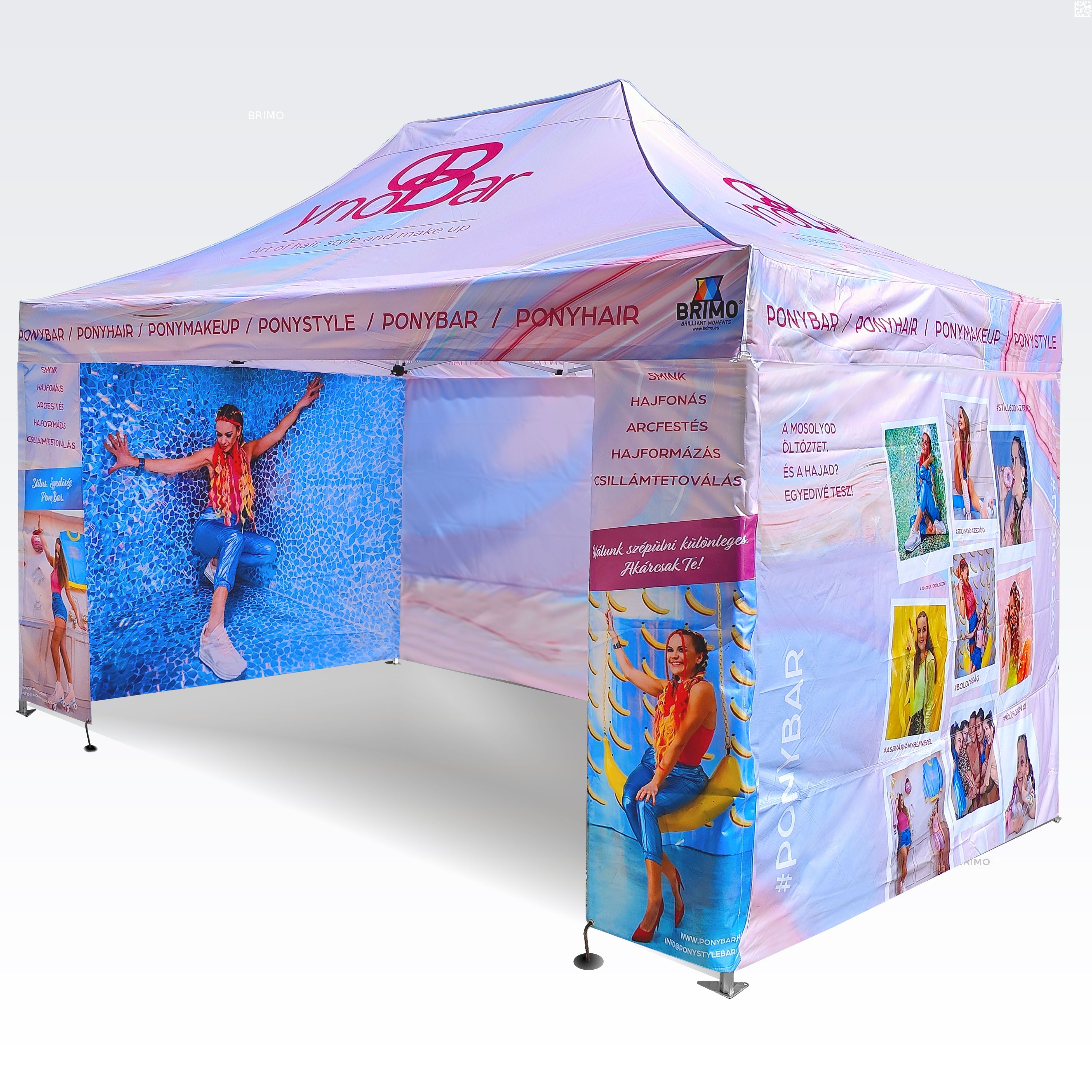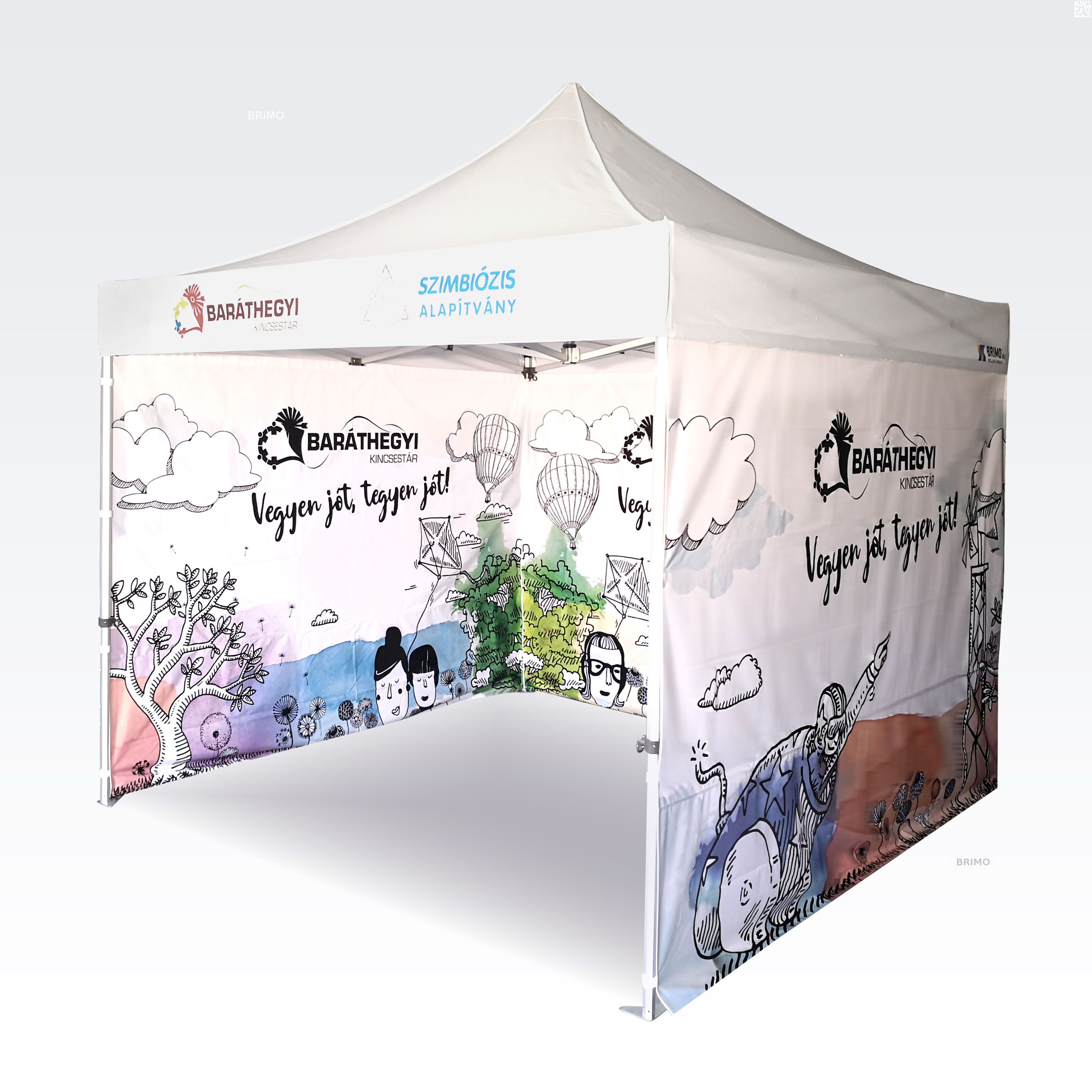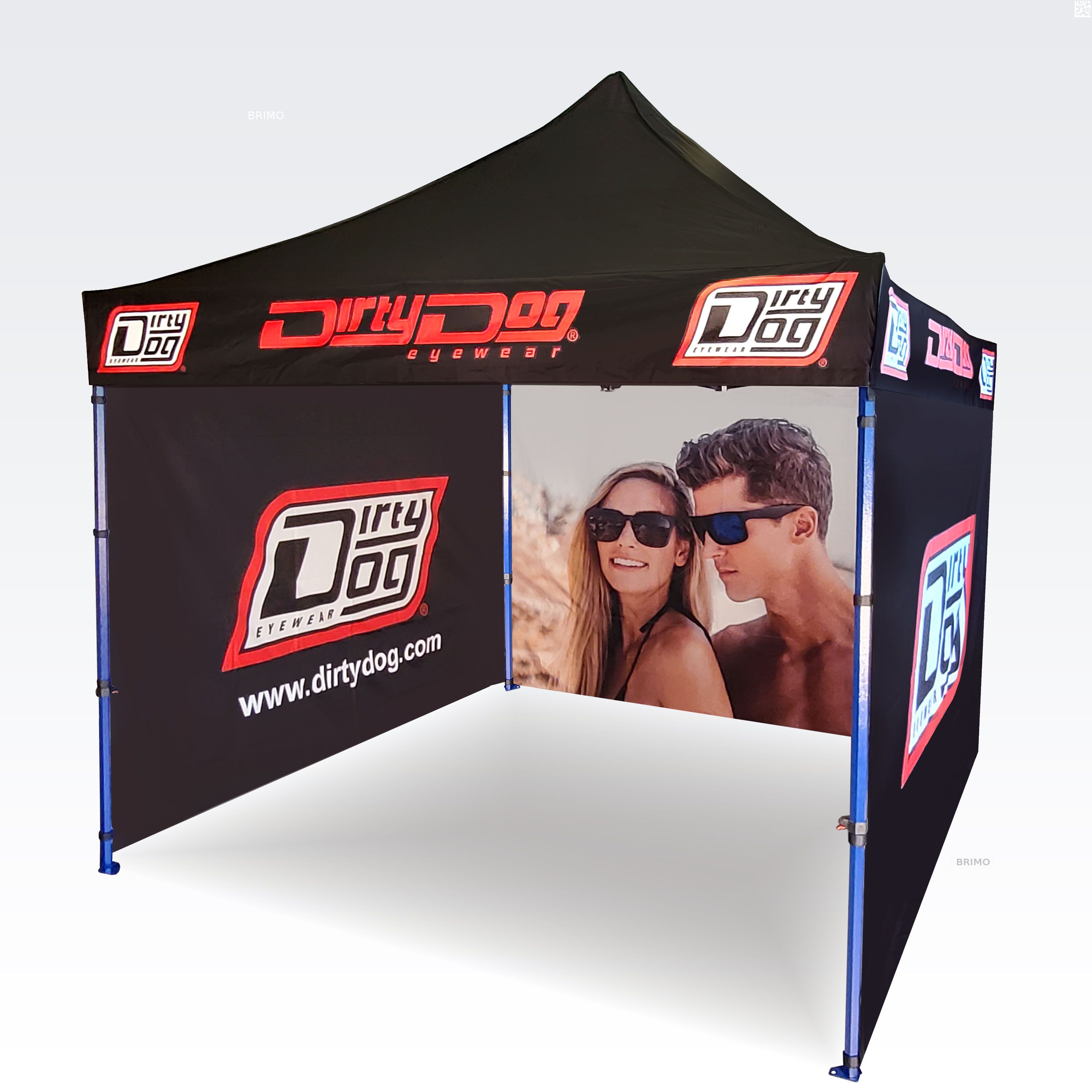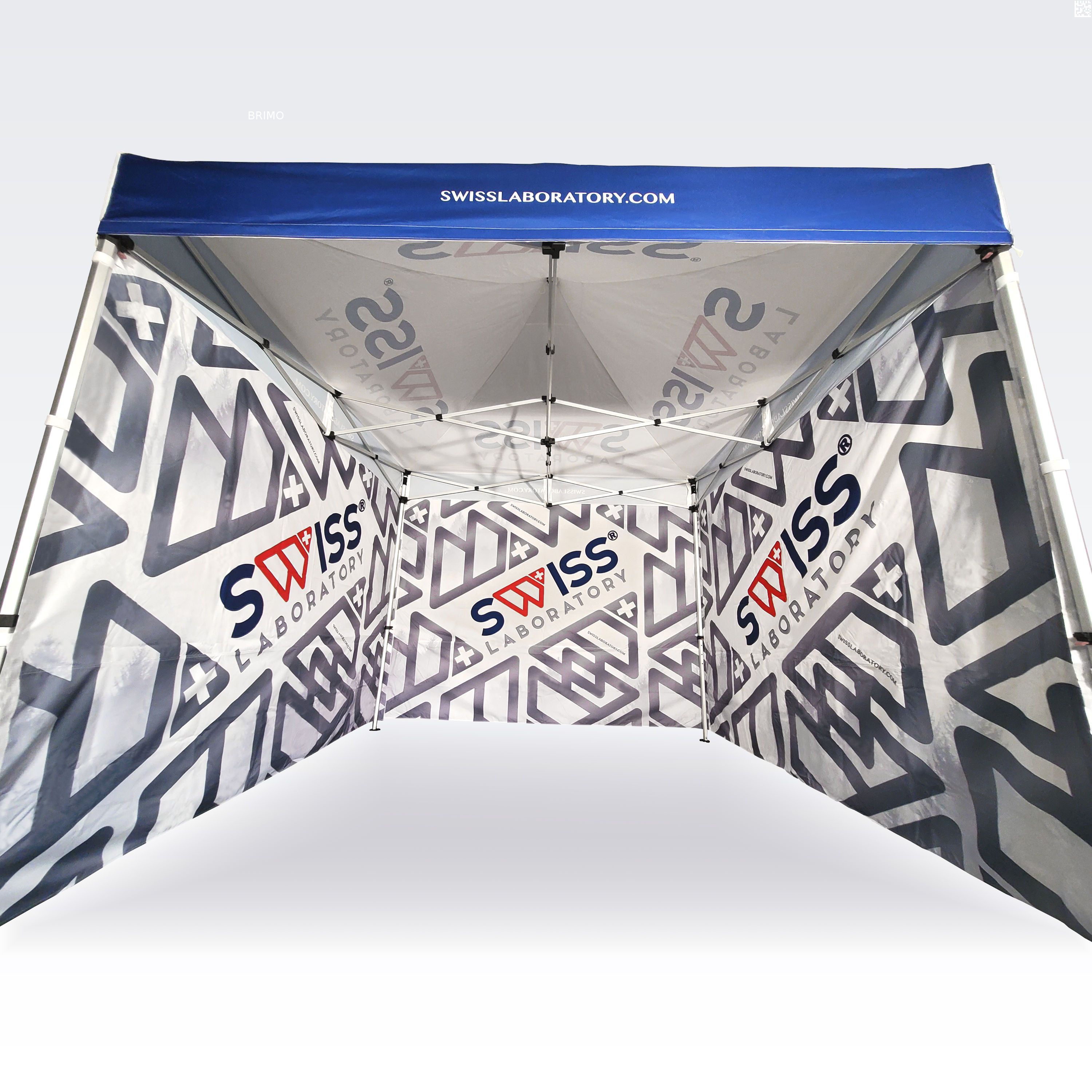 Reklāmas teltis ar digitālo sublimācijas druku. Apdruka rodas ķīmiskā procesa laikā, tinte augstas temperatūras ietekmē iekļūst tieši auduma struktūrā. Logotips, uzraksts, jebkura veida grafika telts iekšpusē vai ārpusē, pēc klienta vēlmēm.